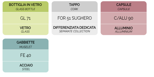 Raccolta differenziata, indifferenziata. Verifica le disposizioni del tuo Comune. Le etichette apposte sulla bottiglia non sono soggette a smaltimento separato dalla bottiglia in vetro.